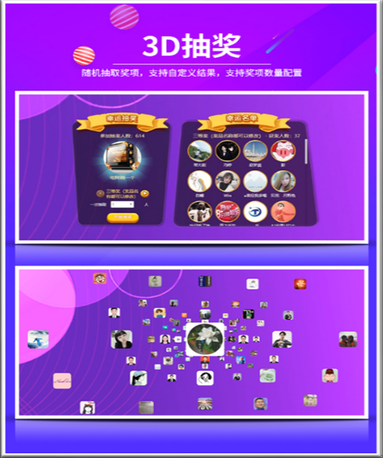 ★來賓掃碼簽到(可對接公眾號在底部做菜單,關(guān)鍵字回復(fù)簽到).★簽到完成微信頭像可同步大屏在大屏端以7種特效酷炫動畫展示簽到微信頭像.★簽到頭像可拼企業(yè)LOGO★后臺數(shù)據(jù)可用于晚宴抽獎,抽獎結(jié)果顯示微信頭像,每輪最多抽20人如獎品數(shù)量多可多增加幾輪.★功能全面(結(jié)合市面較流行的3d動畫完美展示,讓活動更炫酷、更有特 色,更有亮點).★簽到可收集參會人姓名電話以及其他.★可對接九宮格.